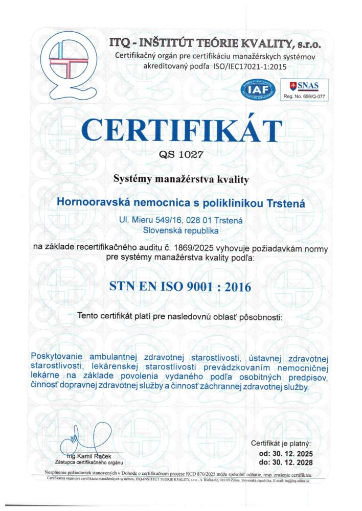 HNsP Trstená v roku 2004 ako jedna z prvých nemocníc získava certifikát kvality ISO 9001, ktorý potvrdzuje dobrú úroveň kvality riadenia.